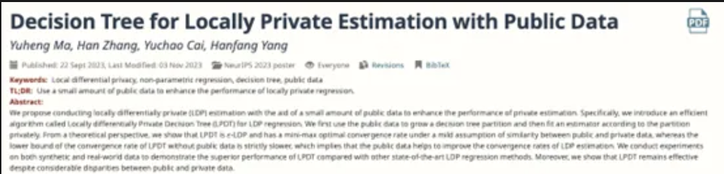 我院学生马宇恒、张涵与杨翰方教授在NeurIPS2023发表论文,提出了使用公开数据辅助局部差分隐私学习。针对非参数回归问题,文章从理论与实验两个角度研究了公开数据带来的优势。